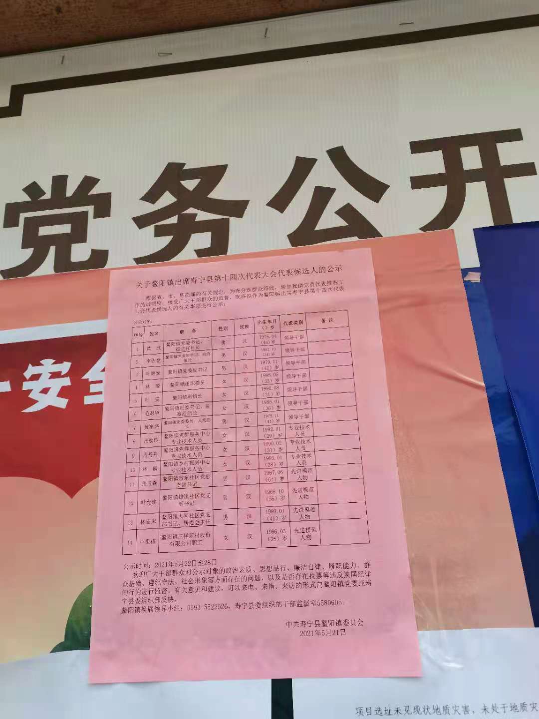 关于鳌阳镇出席寿宁县第十四次代表大会代表候选人的公示