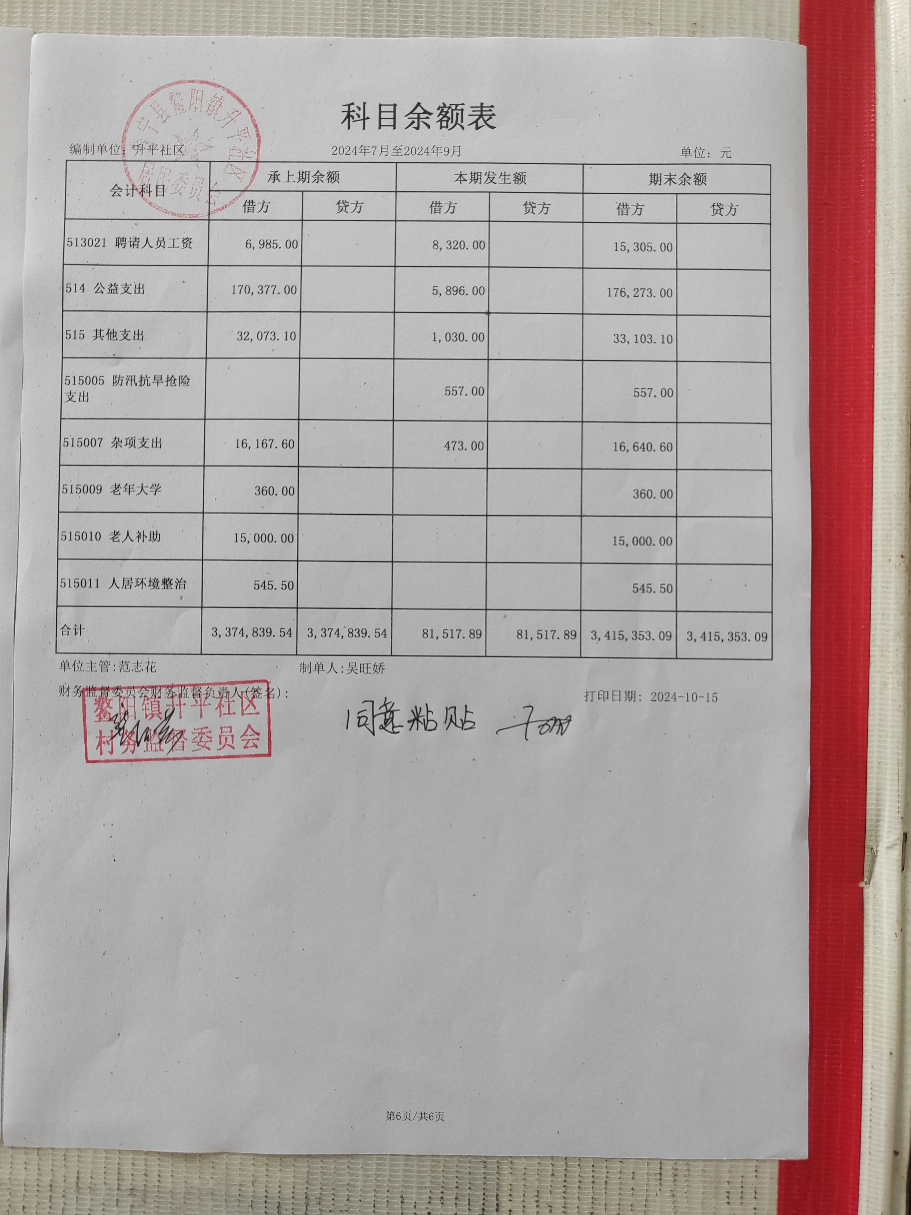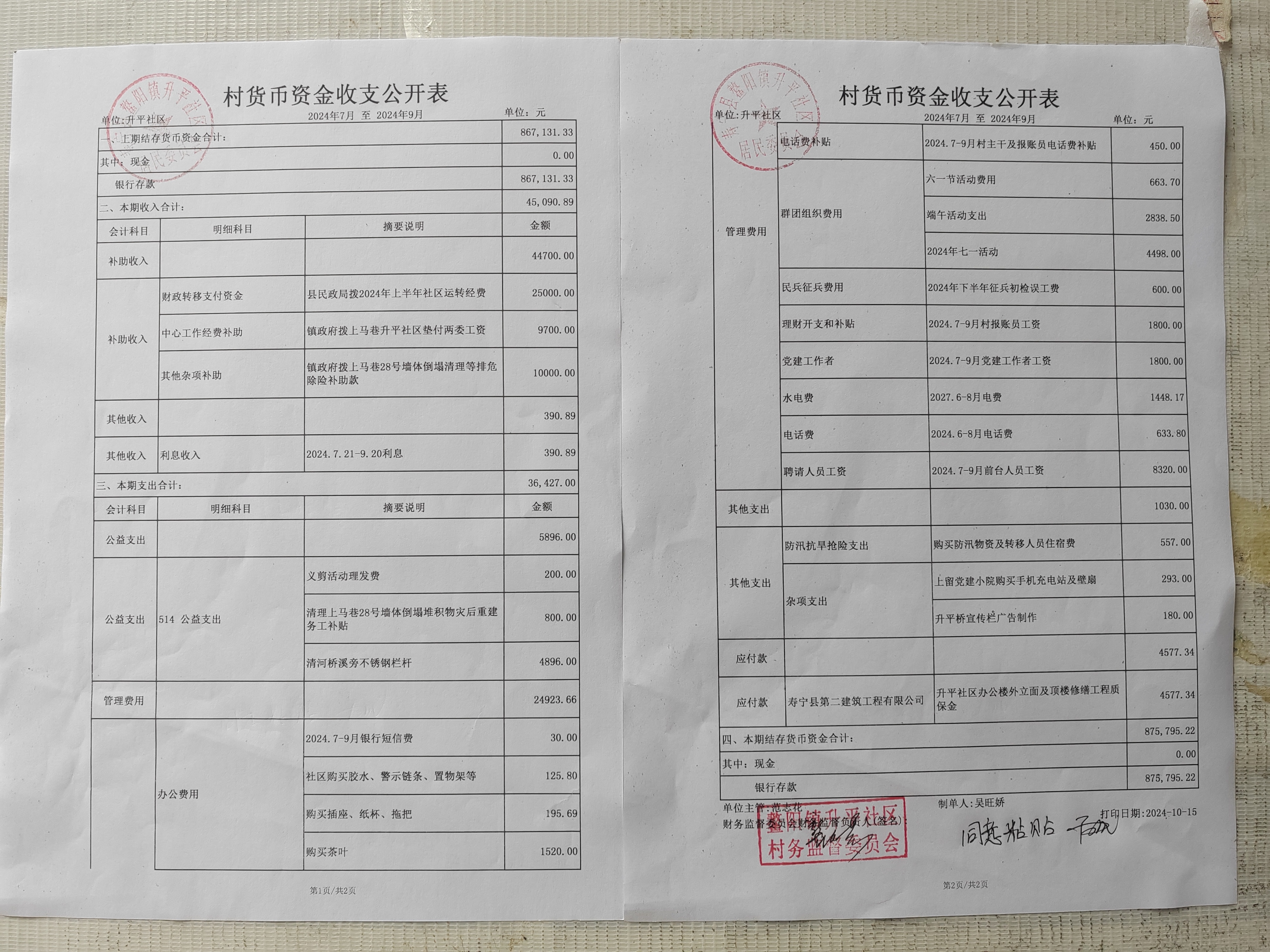 升平社区。2024年第三季度财务公开