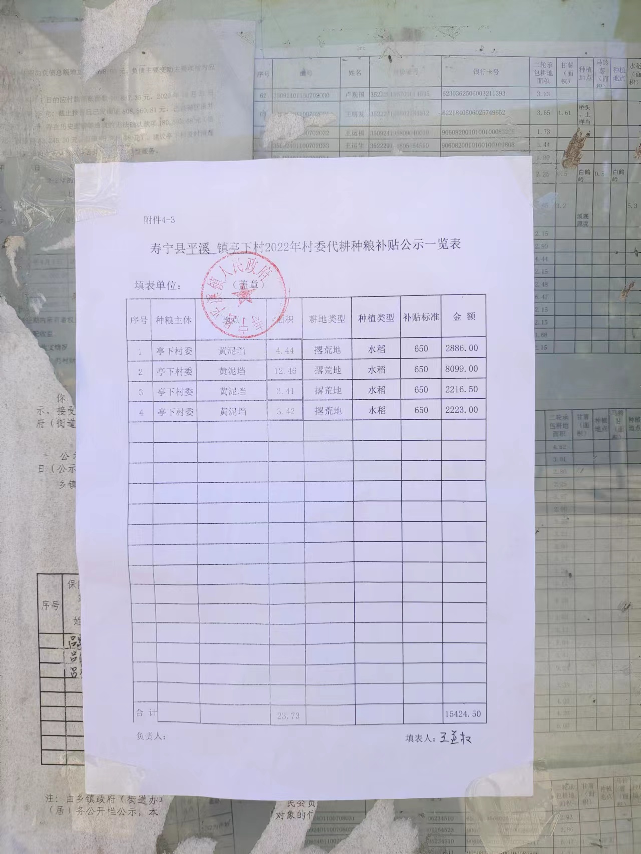 亭下村村委代耕种粮补贴公示