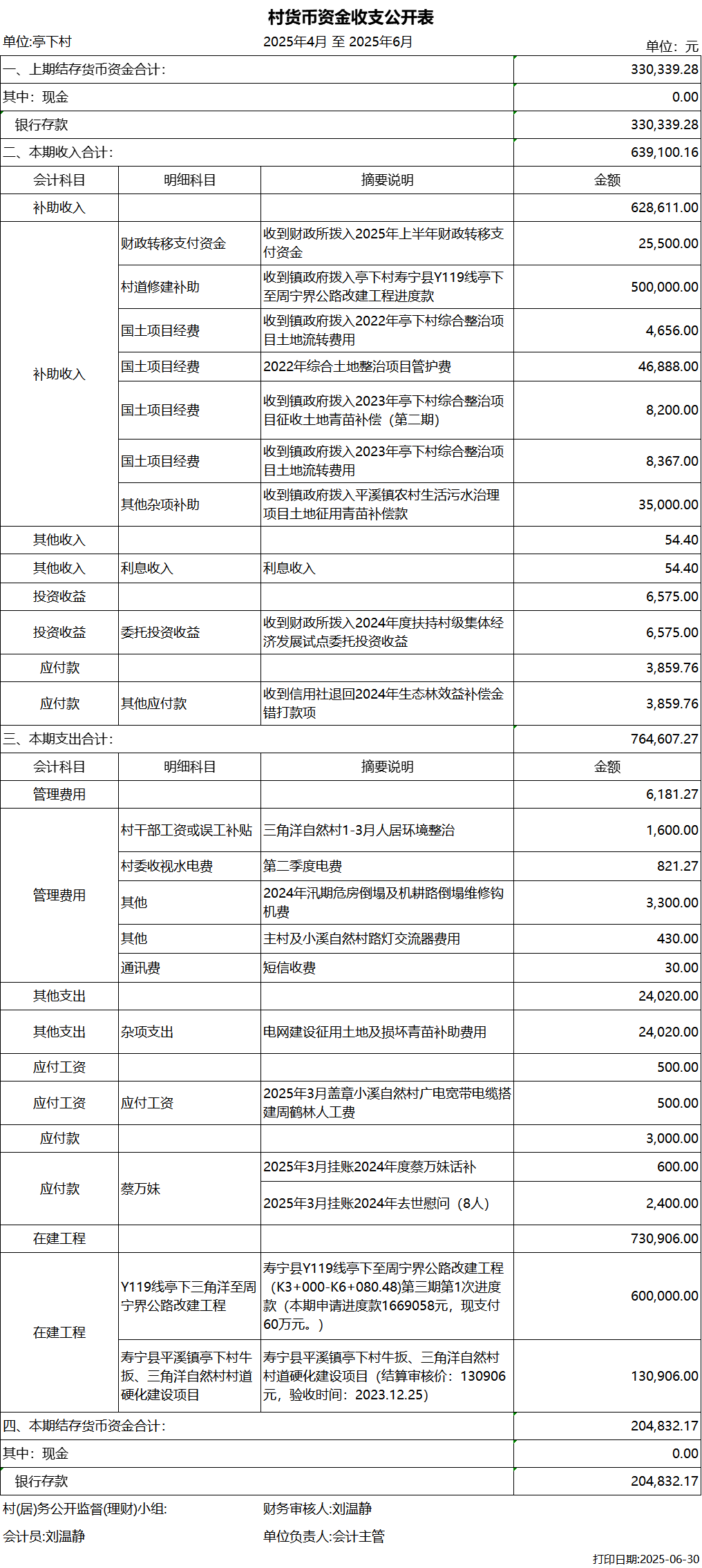 亭下村2025年4月-6月村货币资金收支公开