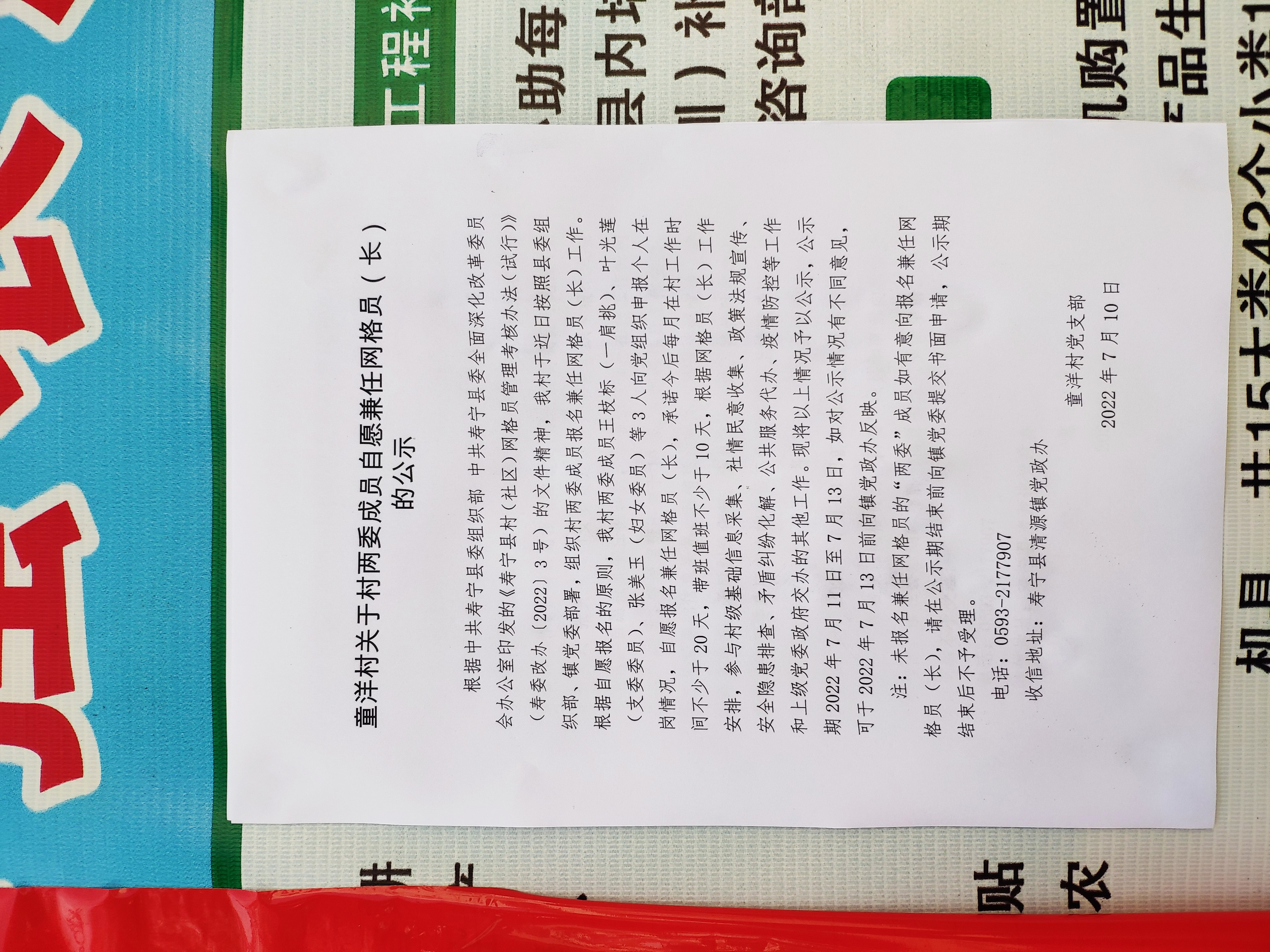 童洋村关于村两委成员自愿兼任网格员(长)的公示
