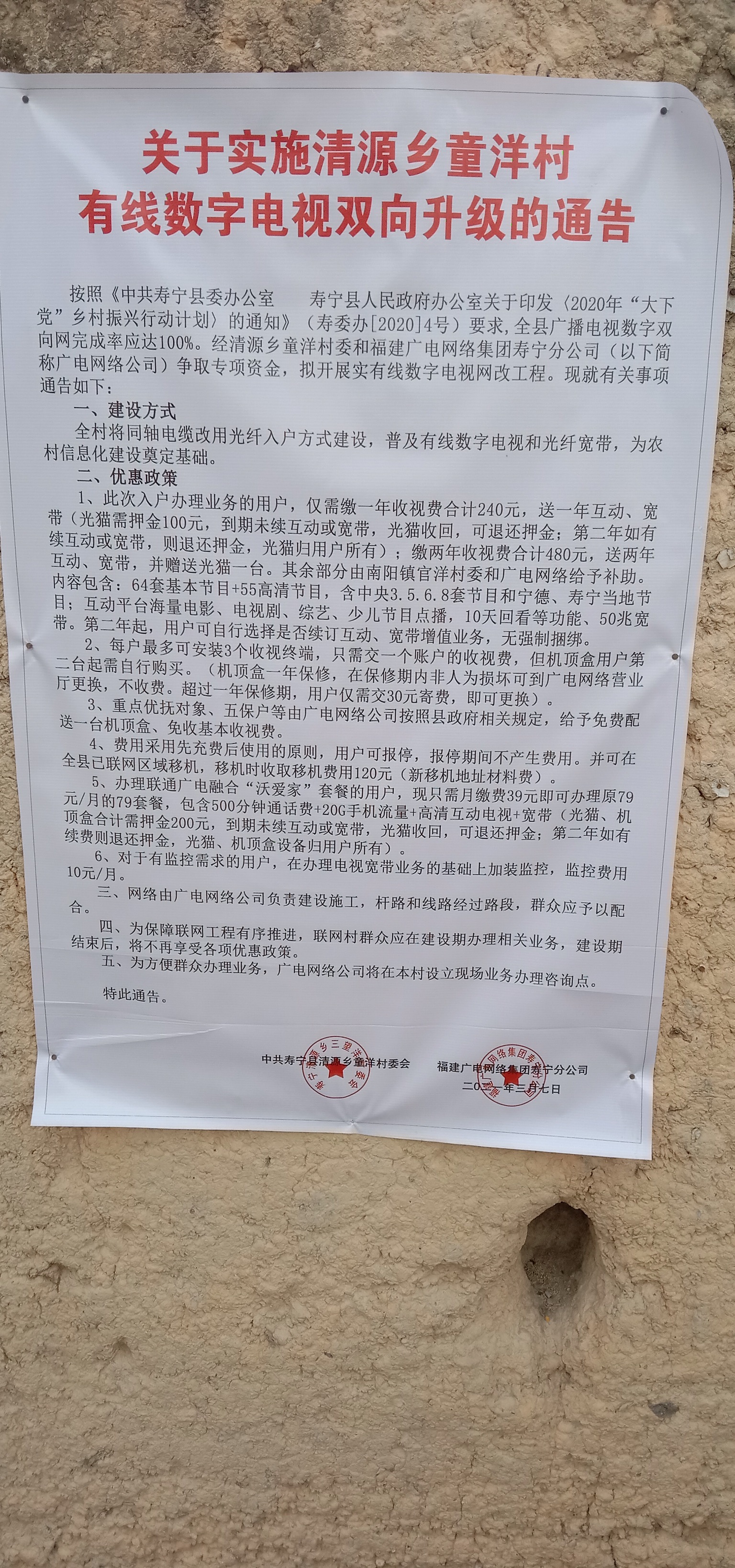 关于实施清源乡童洋村有限数字电视双向升级的通告