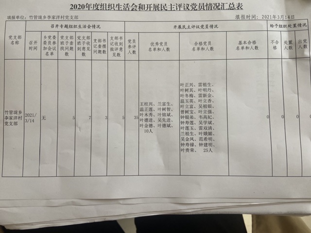 李家洋村2020年度组织生活会和开展民主评议党员情况汇总表